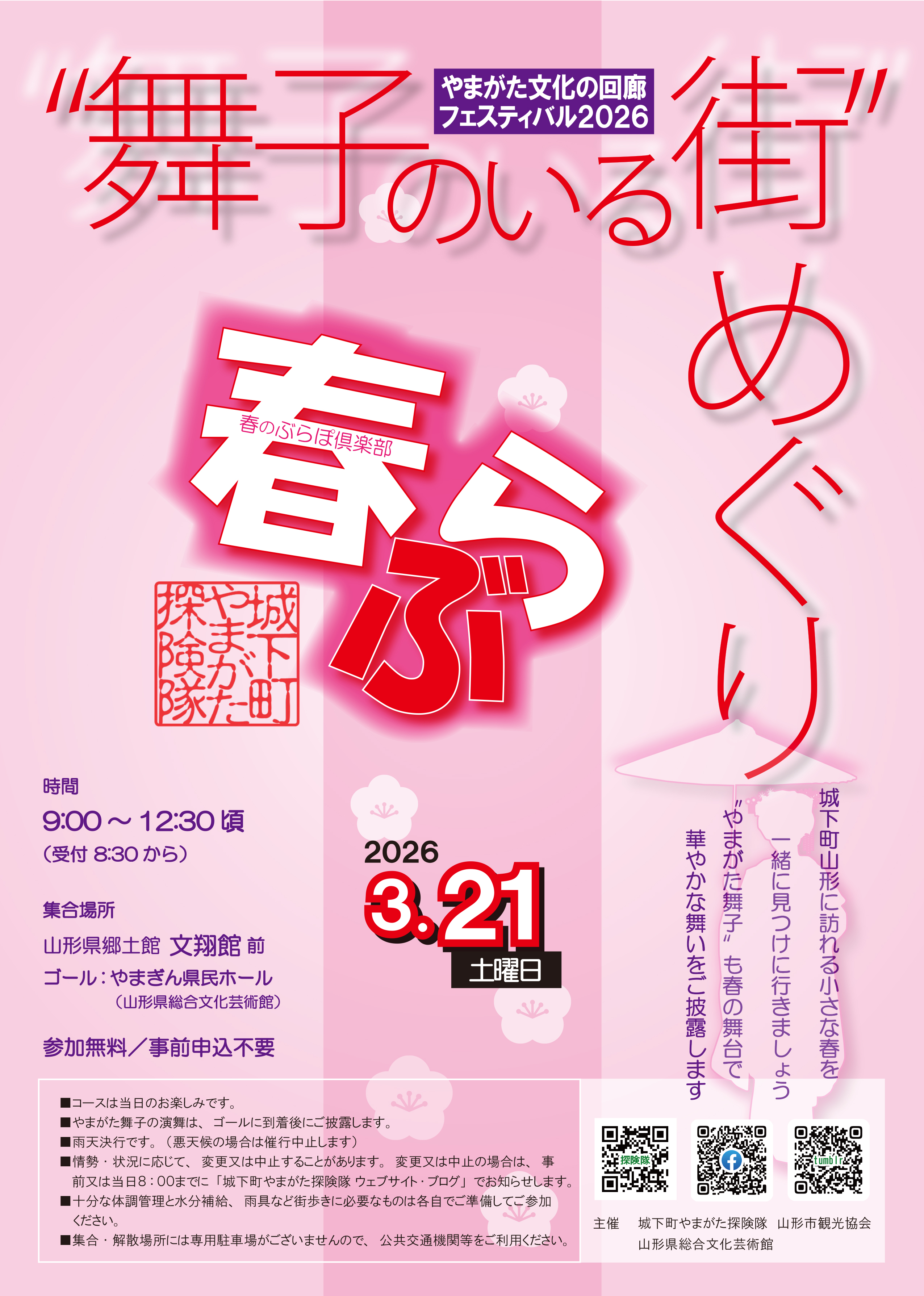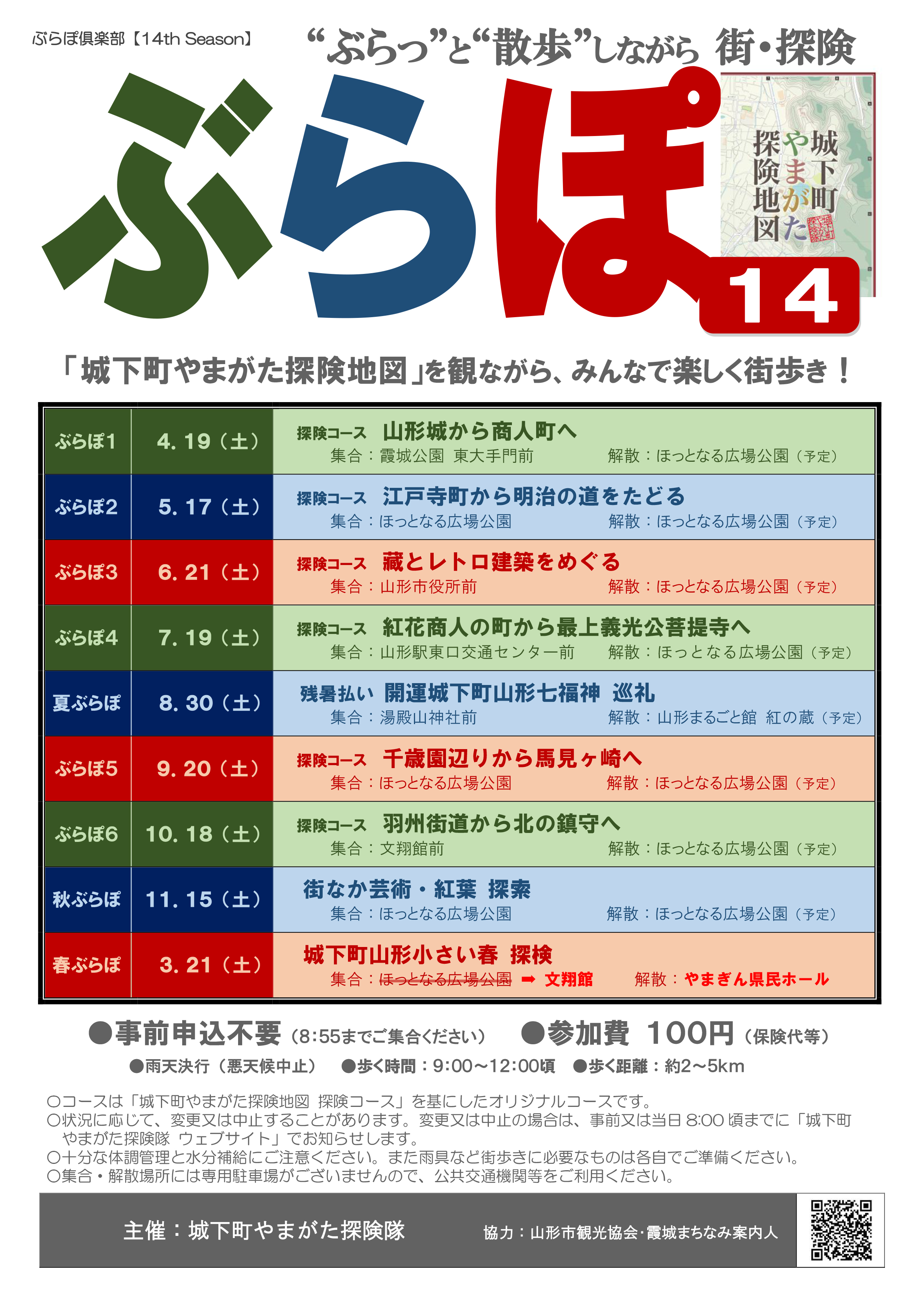 3.21(土)に開催を予定しております「春ぶらぽ 城下町山形小さな春 探検」について、ぶらぽ14チラシの集合場所記載に誤りがありました。正しくは「文翔館前」です。(解散場所は「やまぎん県民ホール」になります)訂正してお詫びいたします。当日は「文翔館前」でお待ちしております。
